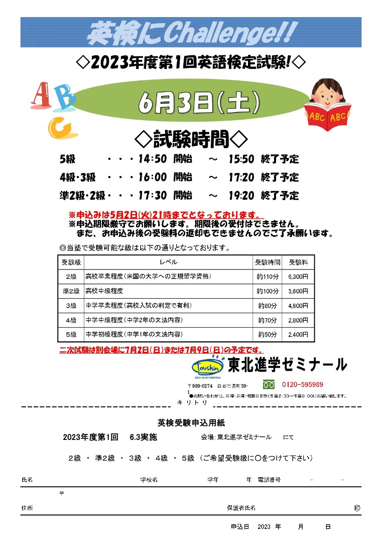 【英語検定試験申込のご案内】 これからの英語は「4技能」が試される時代を迎えます。その時の実力測定に各種民間資格が活用されていきます。中でも、「英検」は、高校入試での優遇措置も多く、大学入試、将来の就職も見据えて、まさに一石二鳥の資格といえます。英検を受検してみよう! 試験日:6月3日(土) 受検級:5級、4級、3級、準2級、2級 会場:東北進学ゼミナール(白石市長町39-1) 申込締切:5月2日(火)21時 詳細は添付の資料をご覧ください。 東進では、英検対策講座もございます。英検対策をしたい方はぜひお問い合わせください。 お申し込み・お問い合わせはこちらのフォームからできます。