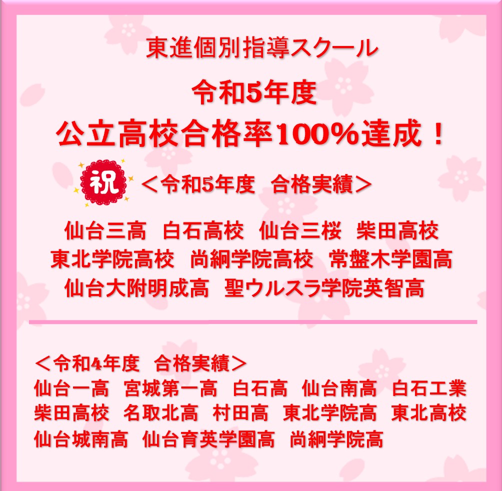 2023年度の高校合格実績です。 <令和5年度 合格実績> 仙台三高 白石高校 仙台三桜 柴田高校 東北学院高校 尚絅学院高校 常盤木学園高 仙台大附明成高 聖ウルスラ学院英智高 <令和4年度 合格実績> 仙台一高 宮城第一高 白石高 仙台南高 白石工業柴田高校 名取北高 村田高 東北学院高 東北高校 仙台城南高 仙台育英学園高 尚絅学院高