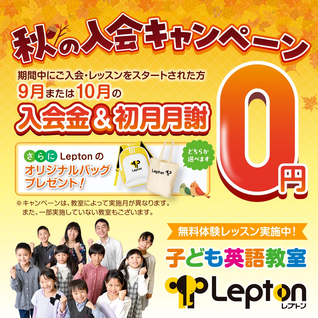 レプトンでは、2025年9月または10月に、新規でご入会、およびレッスンをスタートされた方全員の、入会金&初月無料が”0円”になる「秋の入会キャンペーン」を実施いたします。 さらに、レプトンオリジナルバッグもプレゼント🎁! レプトンは、「聞く・話す・読む・書く」の4技能をバランスよく学べる英語教室です。 「英語を楽しく学ばせたい!」 「学校の英語の授業が始まる前に自信をつけたい!」 「英検にもチャレンジしたい!」 まずは、無料体験レッスンで教室の雰囲気を体験してみませんか?この機会にぜひお子さまと一緒におこしください。 お申し込みは、こちらからお願いします。