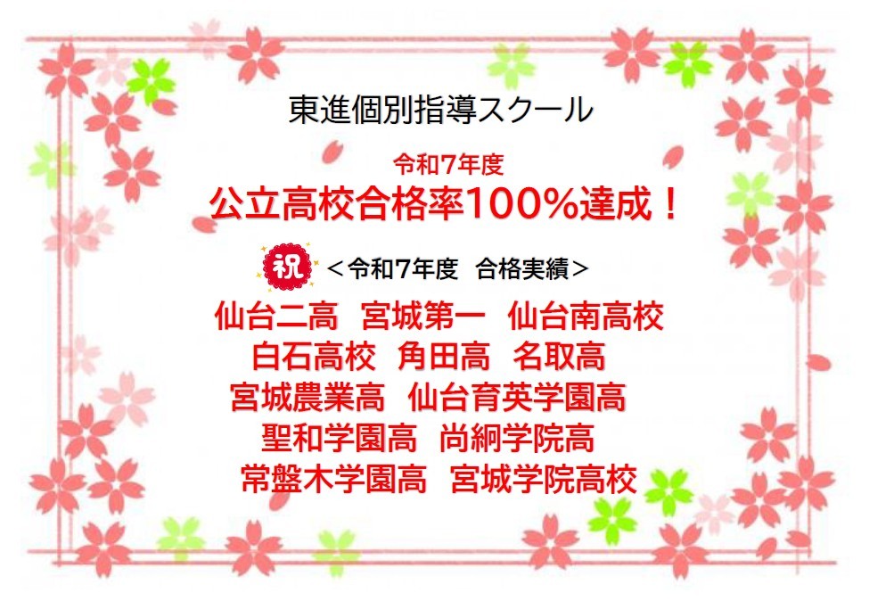 東進個別指導スクールから嬉しいお知らせです。 公立高校の合格の知らせが続々と届いています。 みんなの努力が実を結んでいます。 今年も公立高校合格率100%を達成できました! 勉強に不安のある方は、ぜひ、無料体験授業に参加して東進の良さを実感してください。 お問合せ・お申込みは、お電話(0224-53-8600)またはこちらからお願いいたします。