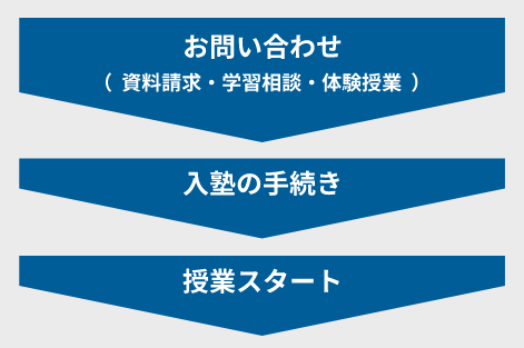 「学習相談」にて、現状の課題や目標を共有し、お子様に最適な学習内容を考えていきます。資料のみ先に欲しいという方は「資料請求」を、事前情報だけでは決めかねているという方はぜひ体験授業をお申し込みください。